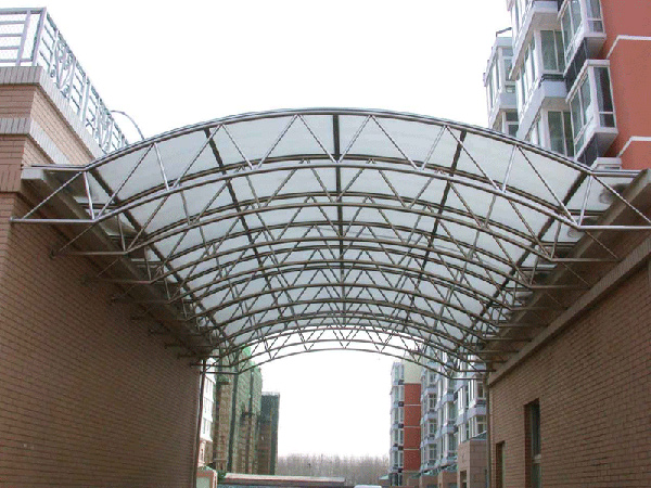 室外鋼結(jié)構(gòu)陽光棚多見于兩座建筑物之間,圖片展示的是位于兩座生產(chǎn)車間的雨棚,由于兩個大樓之間人員流動頻繁,所以建造了這頂雨棚,既可以遮陽,又可擋雨,給這里上班的員工帶來了便利。